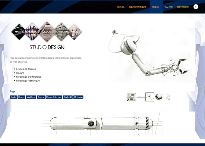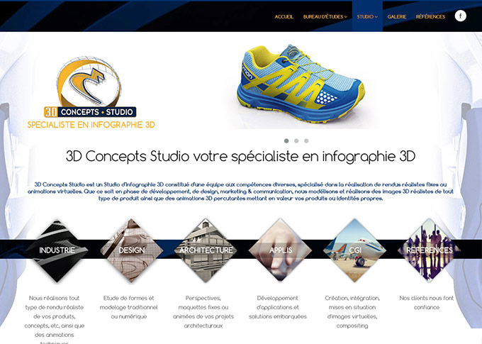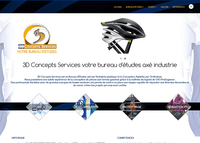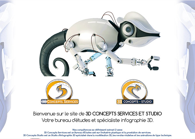 Création d'un site internet pour le studio 3D concepts Studio et le bureau d'études 3D Concepts Services. Design graphique, banners et visuels. Intégration visuels et vidéos dans la gallerie.Site HTML5/CSS3 responsive avec animations jquery.
