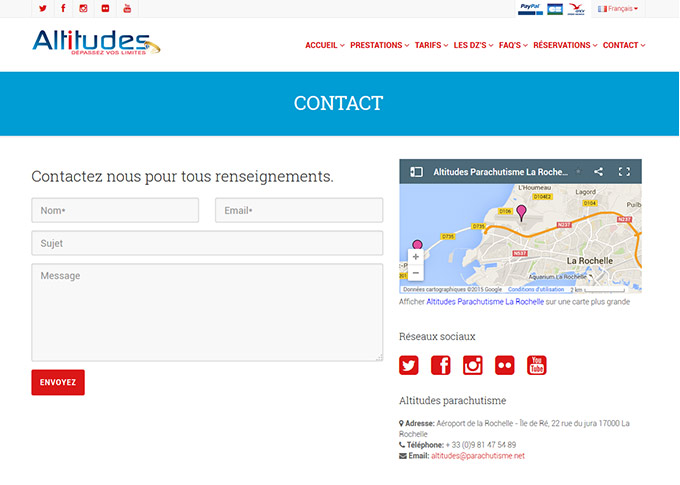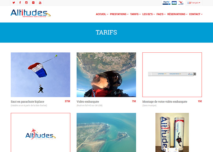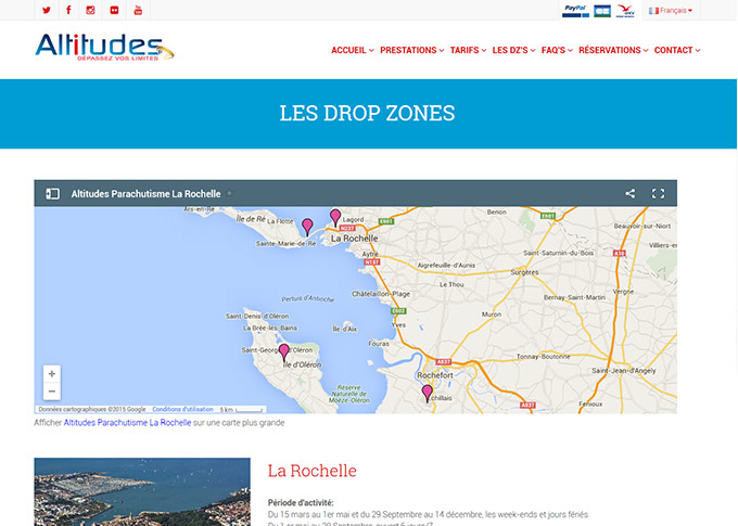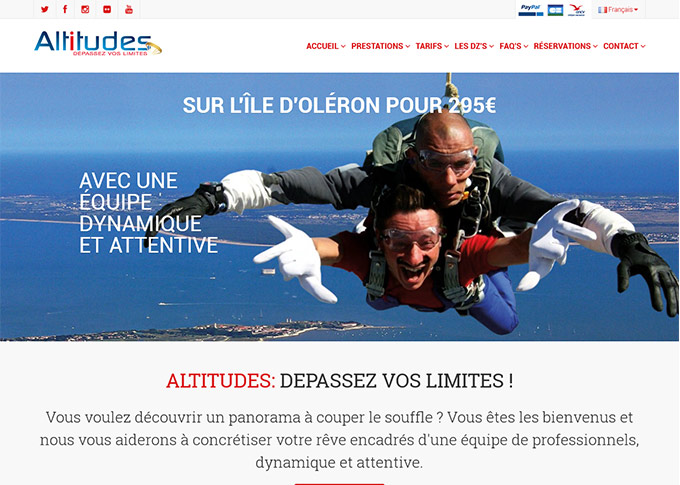 Site de présentation et de réservation pour l'école de parachutisme Altitiudes à La Rochelle - Site responsif multiligue Français/ Anglais avec système de réservation et de paiement via une passerelle bancaire -