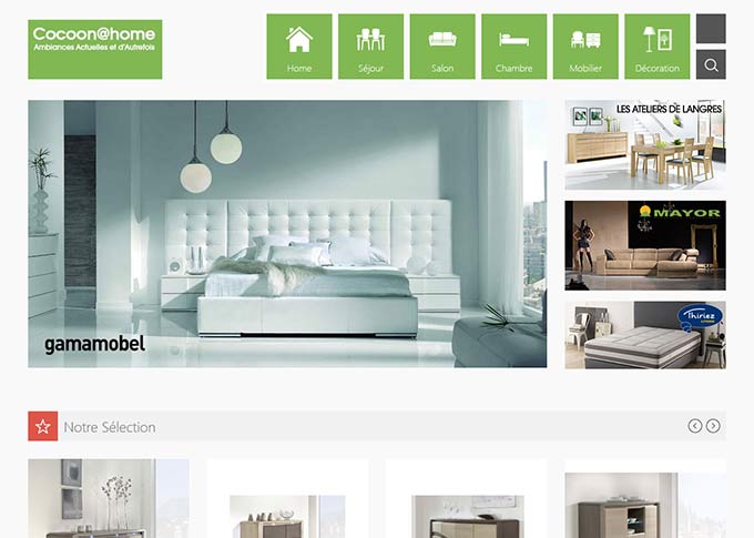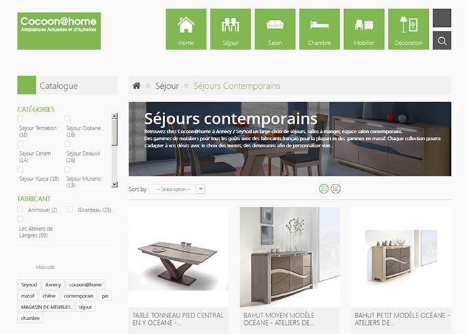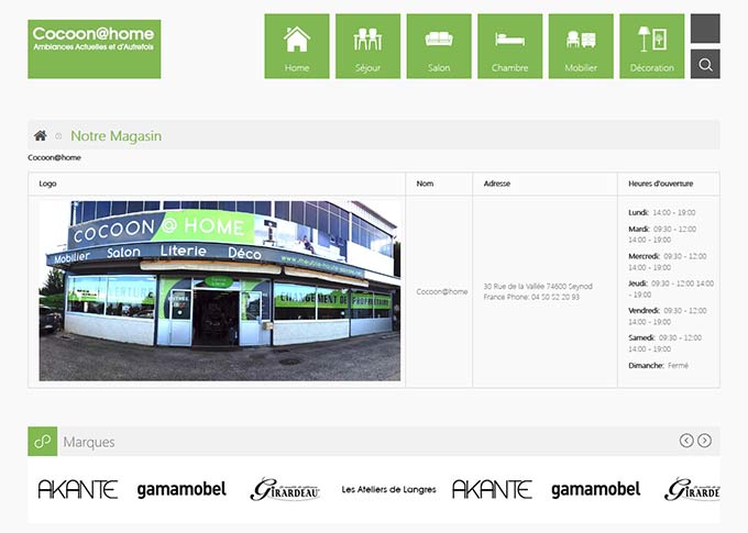 Création du site vitrine Cocoonathome.fr pour le magasin du même nom. Création template graphique, banners. Mise en place d'un systeme de navigation à facettes pour faciliter la recherche produits. Développement sur plateforme E-commerce Prestashop 1.6. Site responsive.
