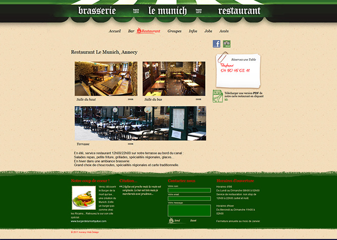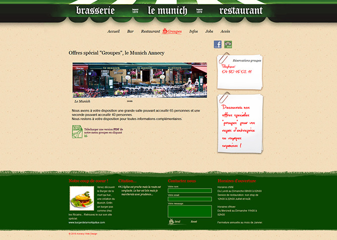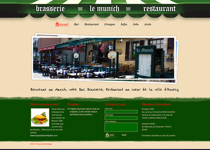 Création d'un site internet pour la brasserie Le Munich à Annecy. Design graphique, création banners et visuels. Intégration slideshow sur toutes les pages ainsi qu'une carte Google maps interactive. Téléchargement des menus sous forme de pdf pour une mise à jour rapide et facile.