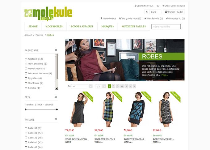 Refonte complete et mise a jour du site de vente en ligne Molekuleshop.fr. Création template graphique, banners. Mise en place d'un systeme de navigation à facettes pour faciliter la recherche produits. Mise en place méga menu avec images produits. Développement sur plateforme E-commerce Prestashop 1.6. Site responsive.