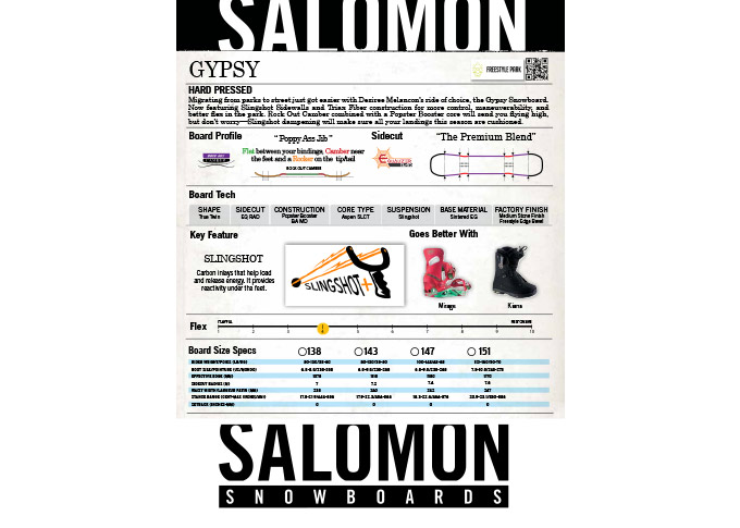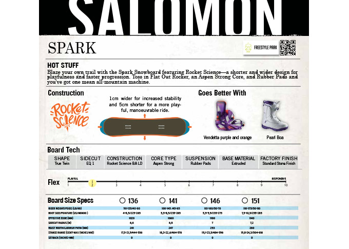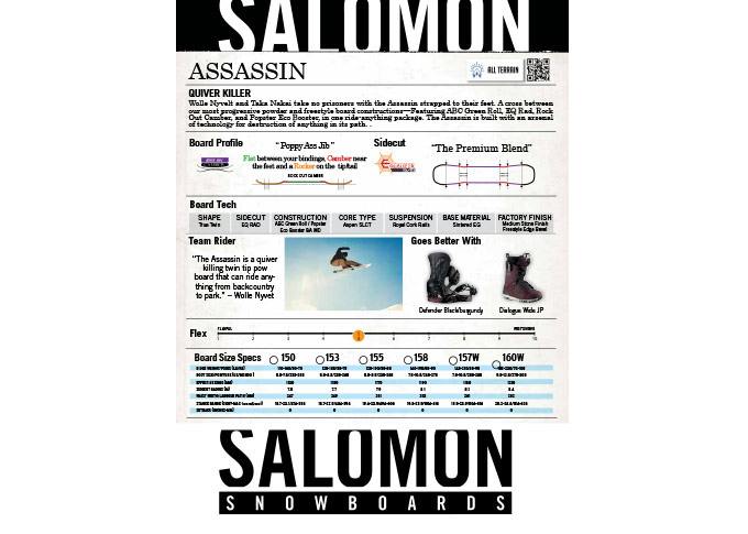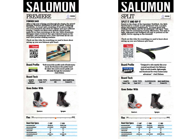 Réalisations des leaflets (fiche produits autocollante sur les semelles des boards) de la gamme de Snowboards Salomon 2015/16. Mise en page, insertions photos, textes et logos.