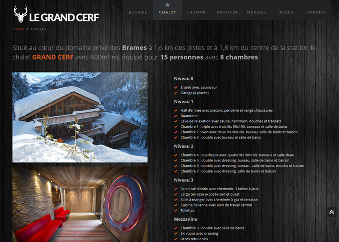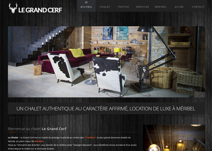 Afin de promouvoir la location de cet authentique chalet au caractère affirmé, nous avons créer un site internet pour le chalet de luxe "Le Grand Cerf" à Méribel - Site responsif multiligue Français/ Anglais/ Russe -
