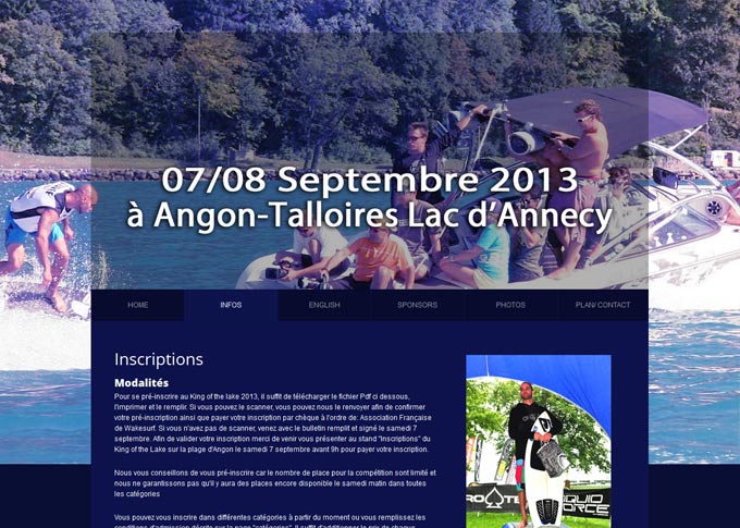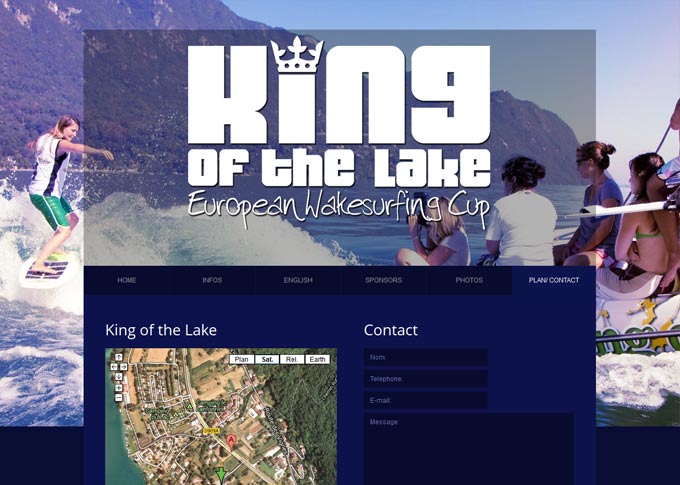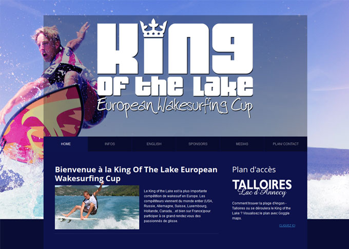 Création d'un site internet pour l'événement sportif "King of the Lake". Design graphique, banners et visuels. Intégration d'un méga slideshow sur toutes les pages ainsi qu'une carte Google maps interactive. Site HTML5 CSS3