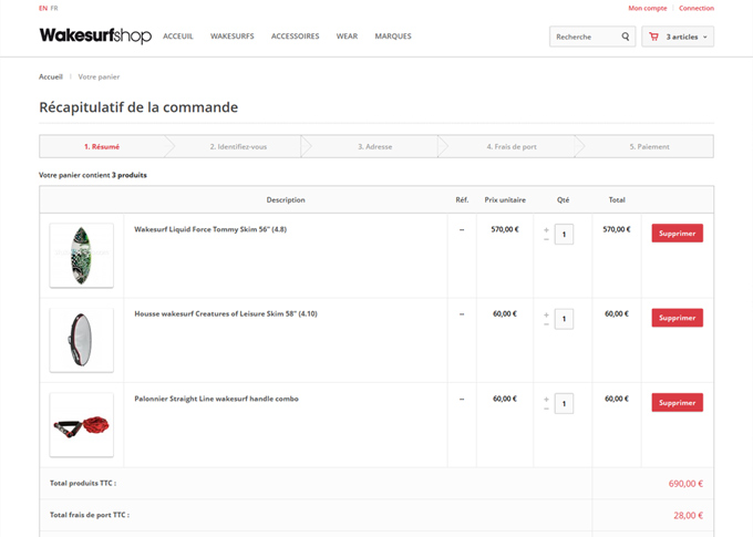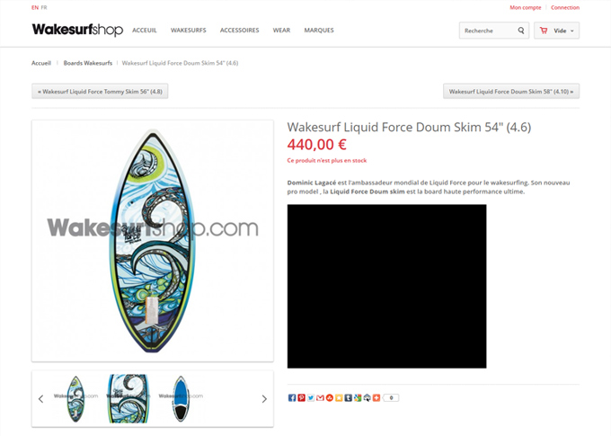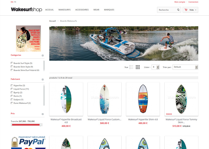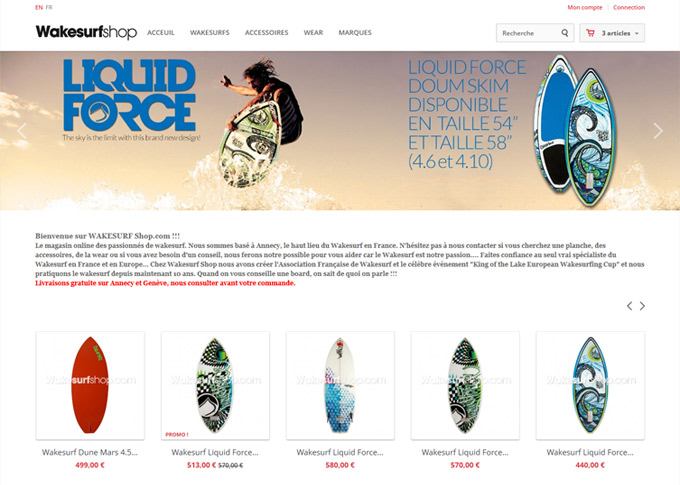 Refonte complete et mise a jour du site de vente en ligne Wakesurfshop.com. Création template graphique, banners, videos présentation produits. Mise en place d'un systeme de navigation à facettes pour faciliter la recherche produits. Mise en place méga menu avec images produits. Dévelopemment sur plateforme E-commerce Prestashop 1.5. Site responsive multilingue Francais/Anglais